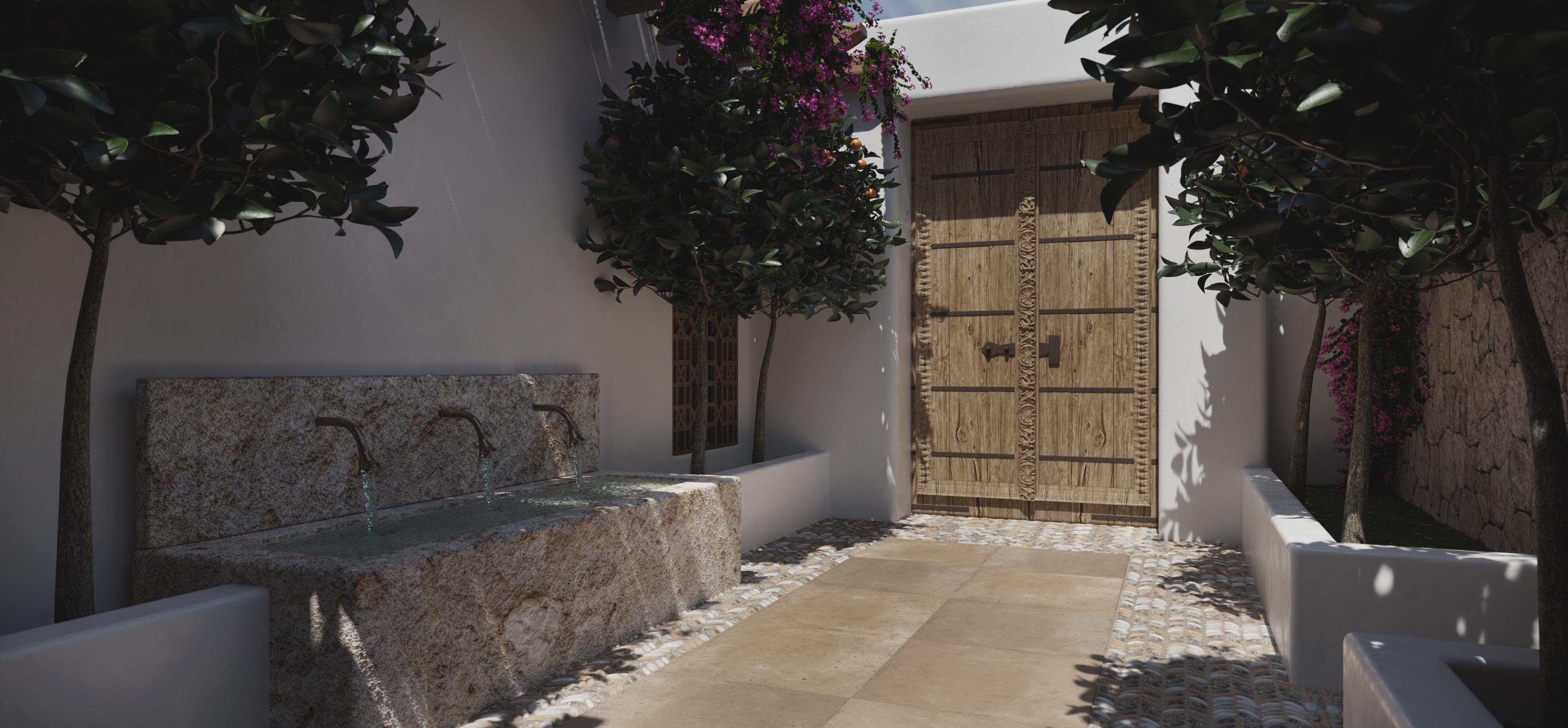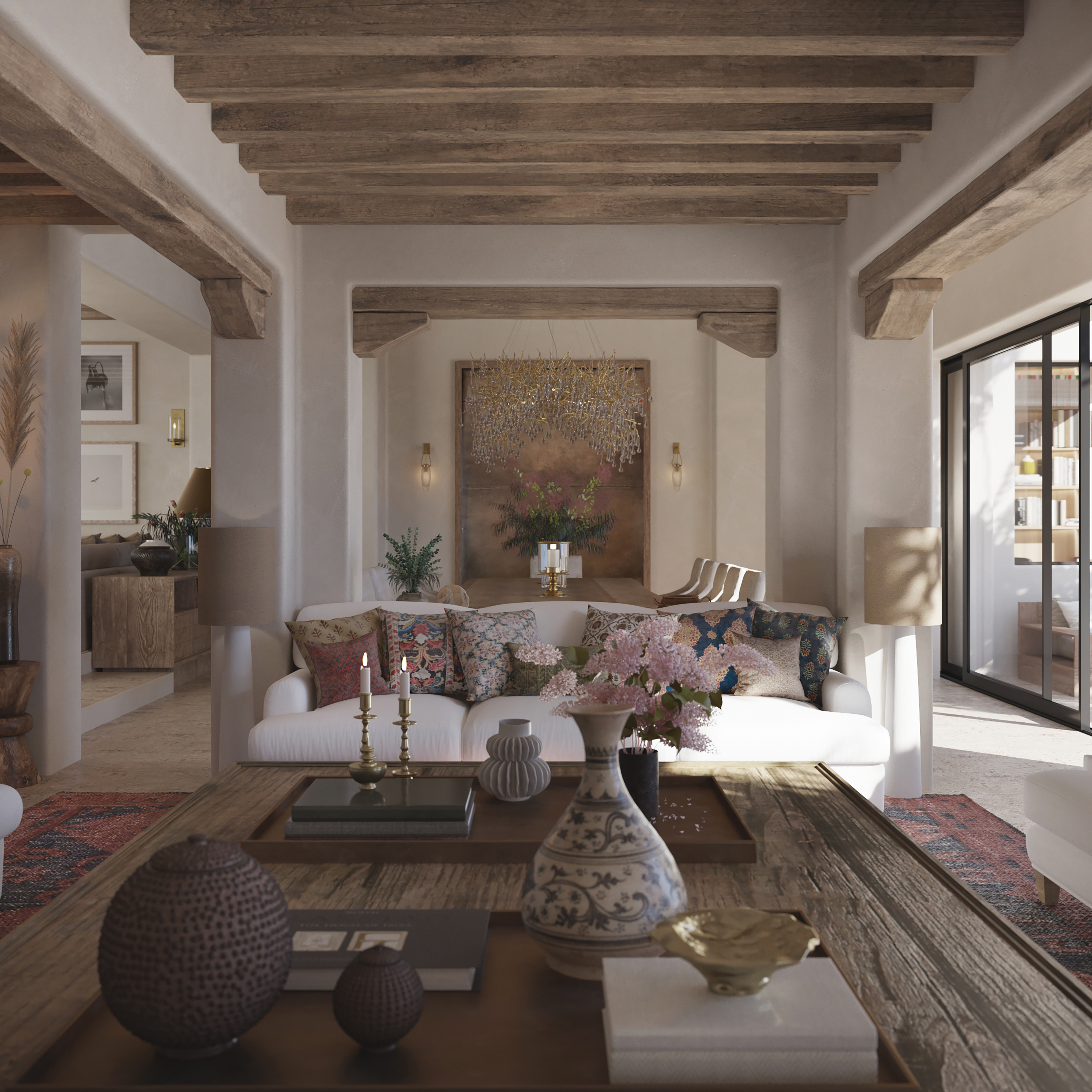 Subtle Moroccan references appear throughout the home as quiet accents. Patterned tiles, textured surfaces and hand-finished details bring warmth to the more rustic architectural language. These elements add depth without crowding the space, offering moments of visual interest. Exposed wood beams are pale and pared back, walls are gently curved at the corners and sliding glass doors dissolve the boundary between indoor and out, all contributing to a seamless flow and a sense of spaciousness.
